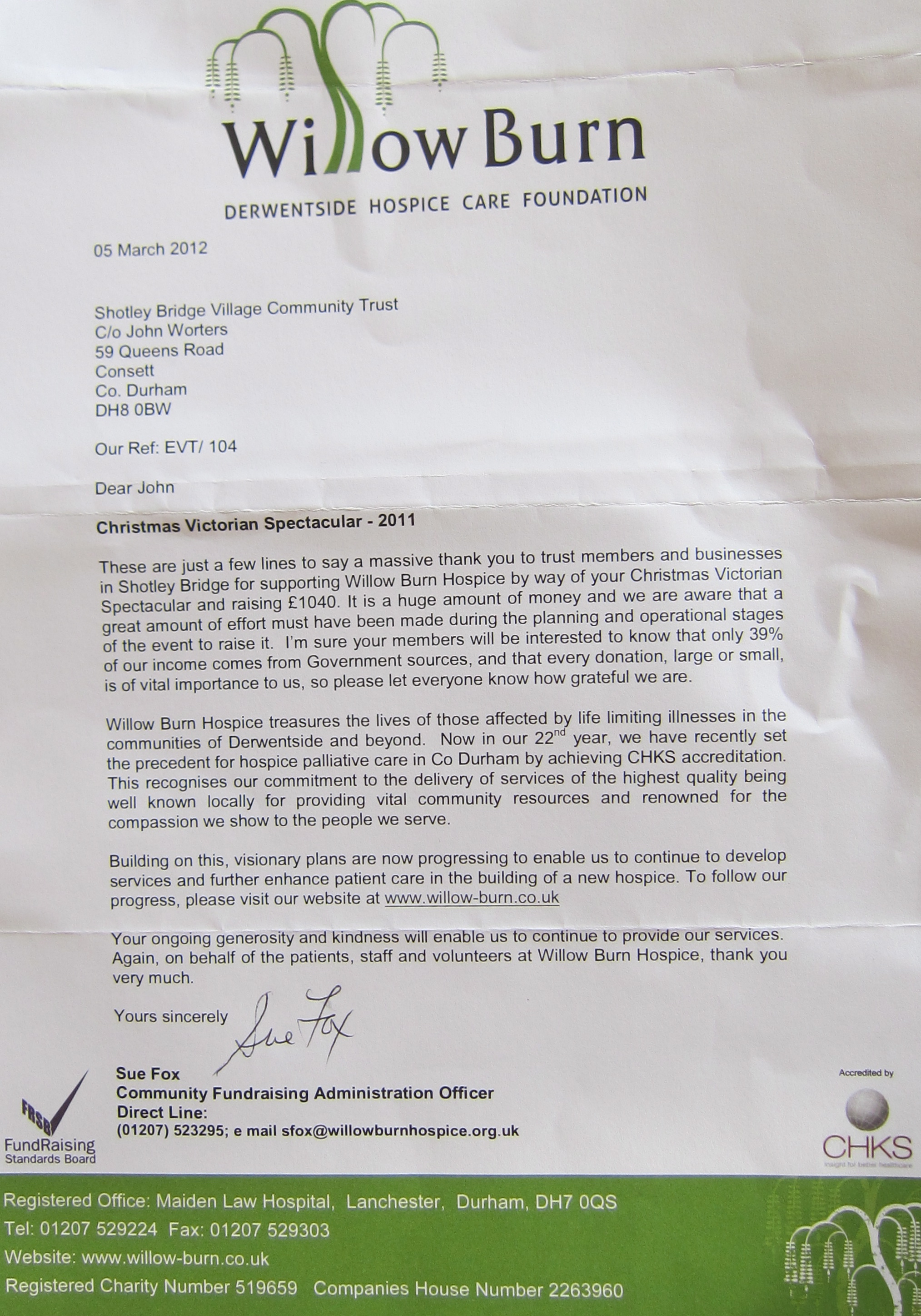 The Village Trust has received a thank you letter, on behalf of the Shotley Bridge Business and Community Partnership, for raising funds at the Victorian Christmas Spectacular.