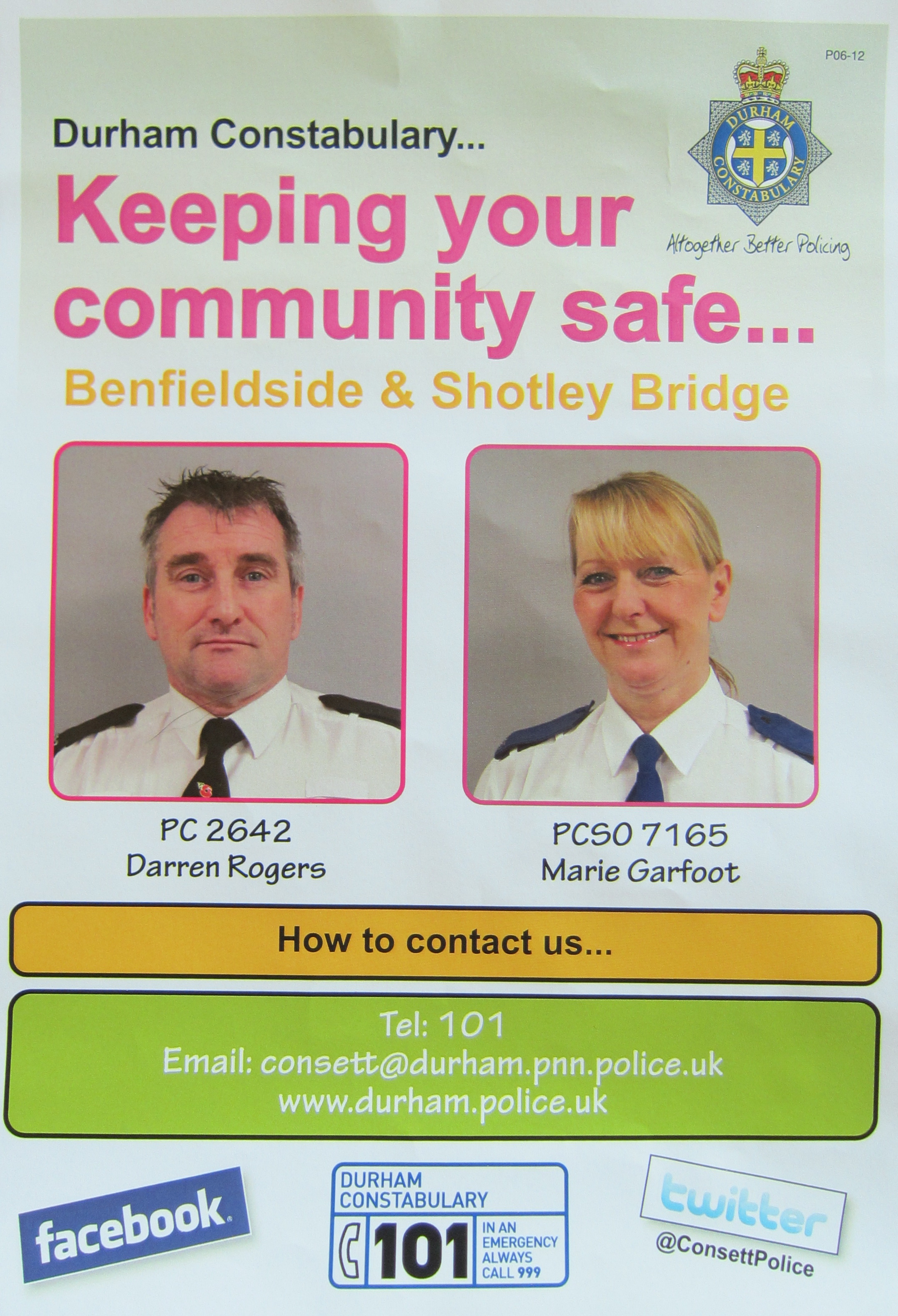 Alternatively go to the local PACT meetings, which are held in the Blackhill Baptist Church Hall on the first Thursday of each month, as part of the Benfieldside, Blackhill, Bridgehill and Shotley Bridge Community Partnership meetings.