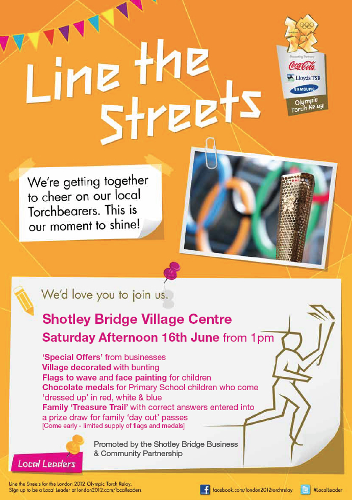 The Shotley Bridge Business and Community Partnership. which organised the Victorian Christmas Spectacular, is inviting you to spend the afternoon [from 1pm] in the village centre, prior to the torch’s arrival. The village will be decorated with bunting and red, white & blue flowers. Thanks to John Beales for putting up and taking down the bunting, free of charge.