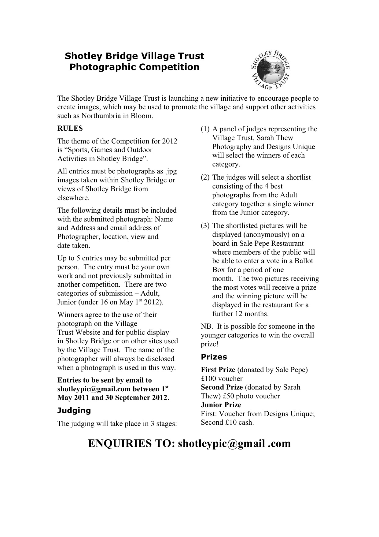 The theme of the Competition is “Sports, Games and Outdoor Activities in Shotley Bridge”.