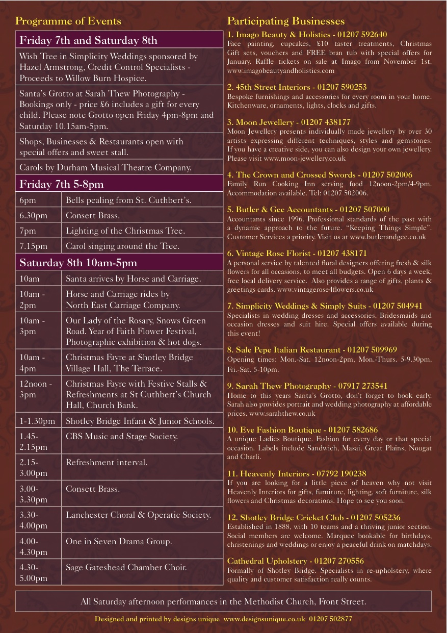 The Shotley Bridge Business and Community Partnership has finalised its plans for the Christmas Spectacular this year, which will be held on Friday 7th and Saturday 8th December. Posters and leaflets have been printed. [Click on the images to find out more.]