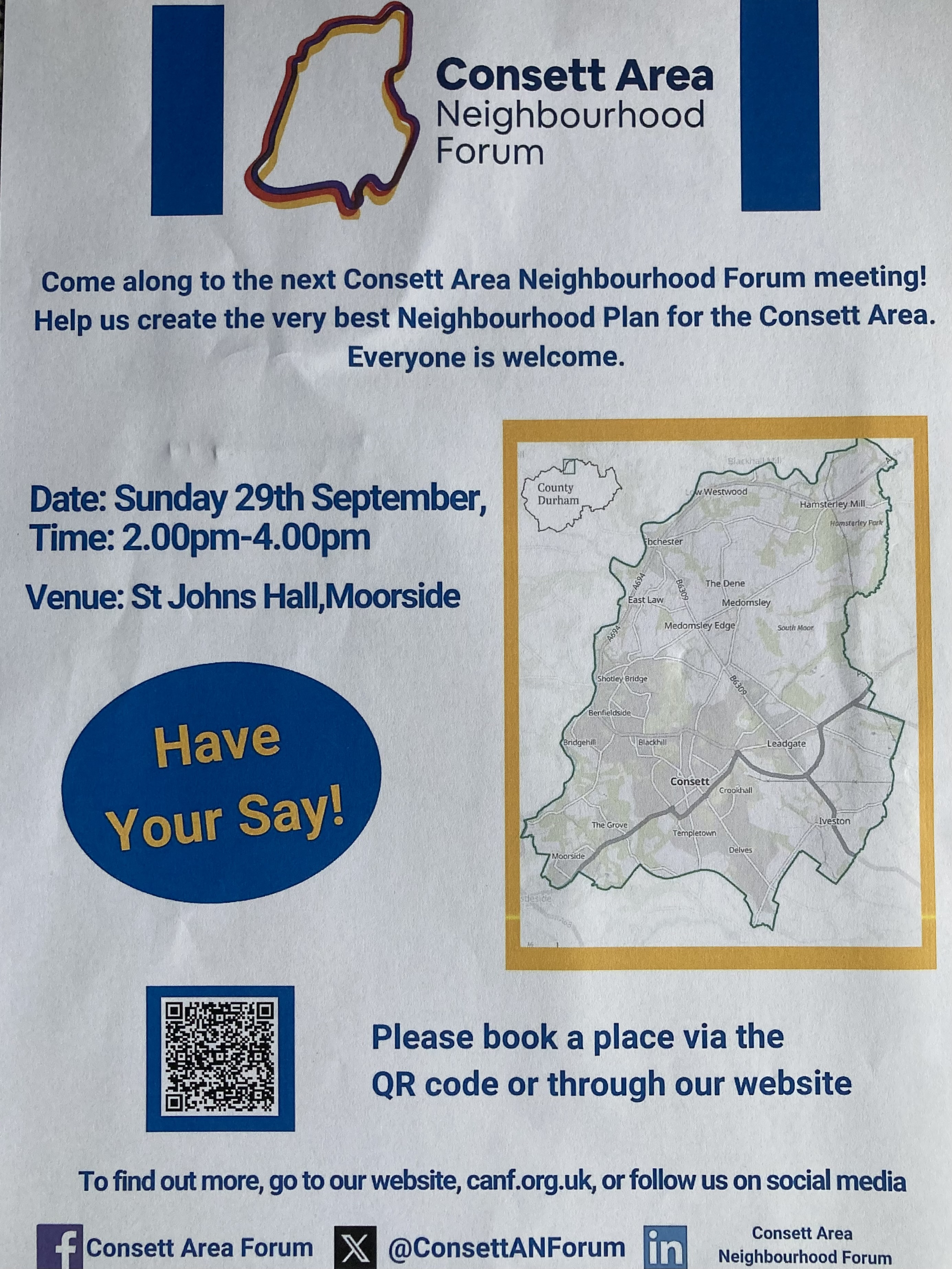 More information about the process/timescale of the Plan and how to make your views known can be found on canf.org.uk or at the next meeting of the Consett Area Neighbourhood Forum, this Sunday.