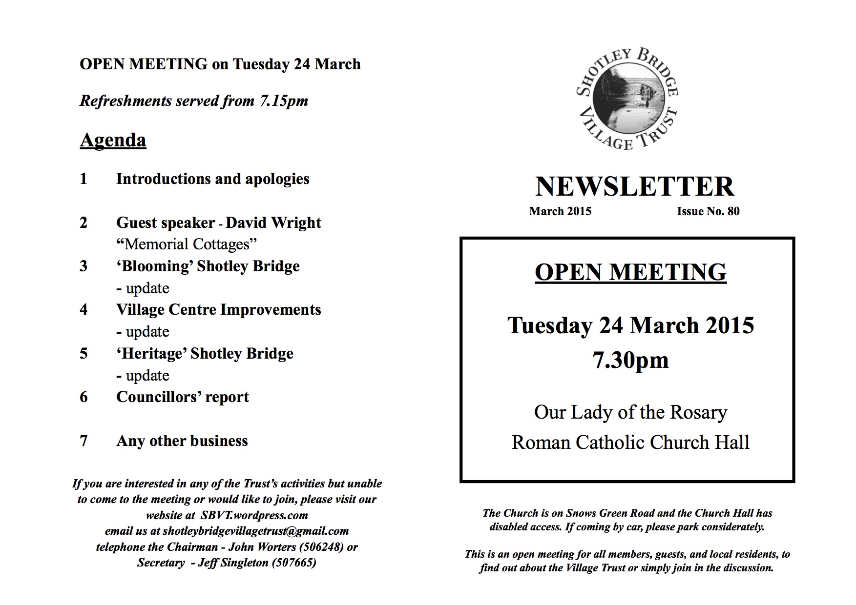 The next Open Meeting of the Village Trust is to be held in 3 weeks time, on Tuesday evening 24 March, when Russell Black will be giving a talk about the Memorial Cottages. Everyone is welcome.