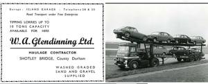 A family run haulage firm, Glendinning, was incorporated in 1952 though it was in operation before the war and therefore ran for well in excess of 60 years until it was wound up. The firm operated a large fleet of well over 30 lorries that became a regular sight on local and national roads carrying everything from motorcars, to materials and manufactured goods. It was one of the largest businesses operating in Shotley Bridge post 1954 and the closure of the gasworks. It was based on Bridge Island, in the centre of the village before the area was redeveloped in the early 2000’s as a small housing estate.